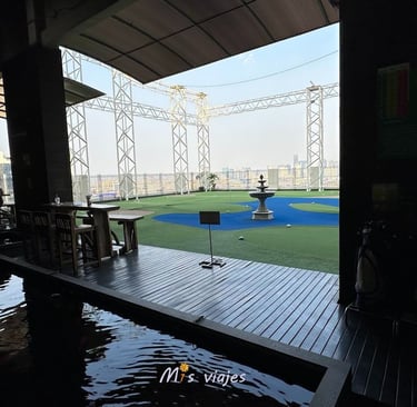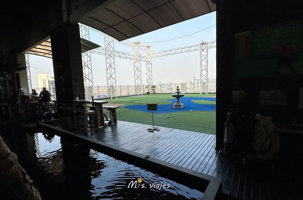 El ascensor que cogemos en la recepción nos dejará en la planta 18, donde hay unas cristaleras impresionantes desde donde podemos ver la ciudad, tomar algo en la cafetería o jugar una partida al Mini golf.