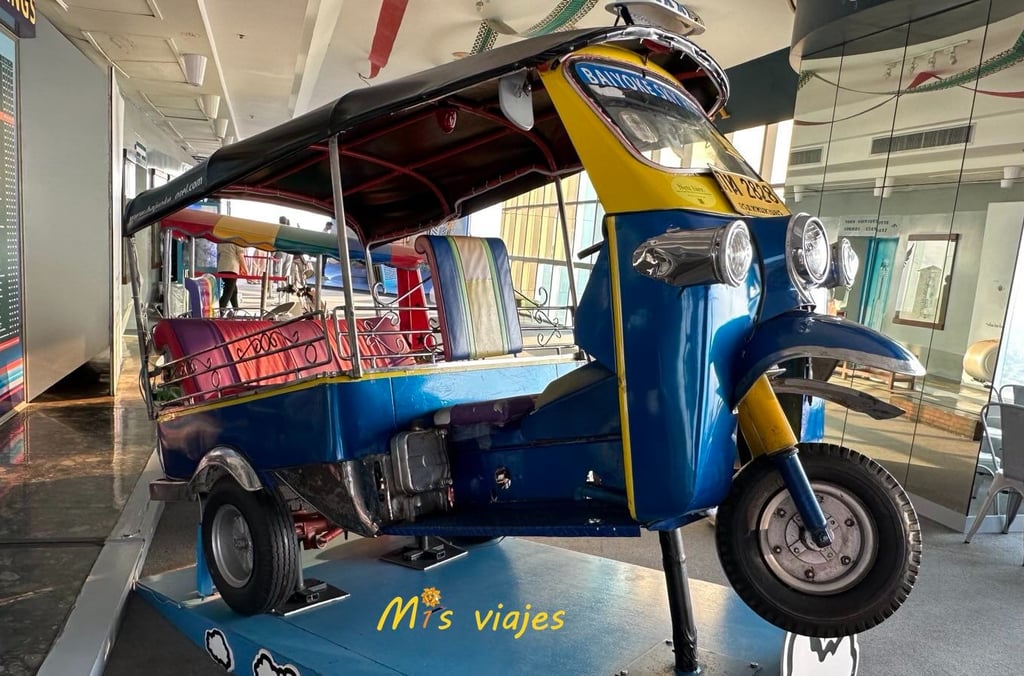 Este tuk-tuk se encuentra en un área destinada a entretenimiento y experiencias turísticas dentro de la torre, junto con otros elementos que muestran la cultura tailandesa.