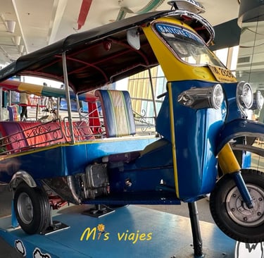 El tuk-tuk, un símbolo icónico de Bangkok y Tailandia, se utiliza como una especie de atracción dentro del edificio para que los visitantes puedan tomarse fotos y disfrutar de la atmósfera local.