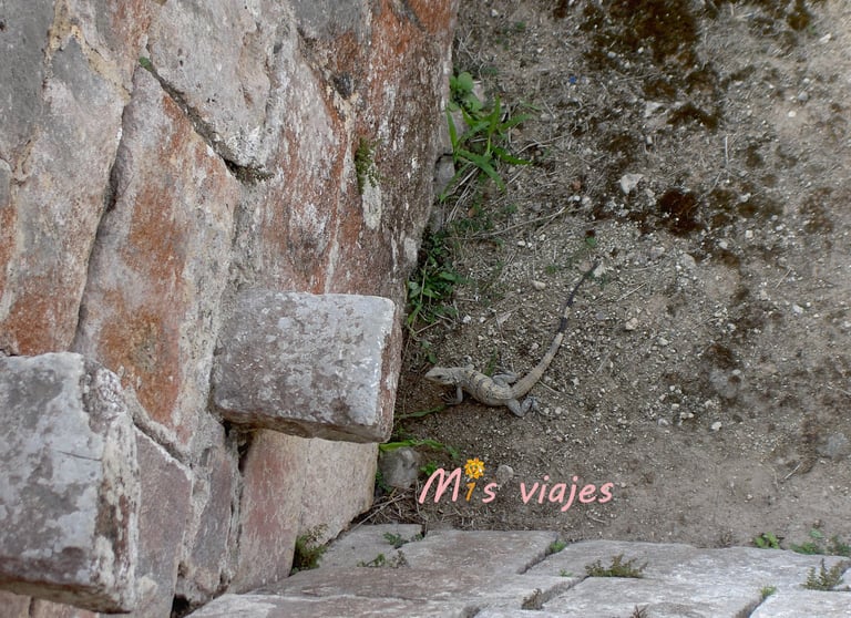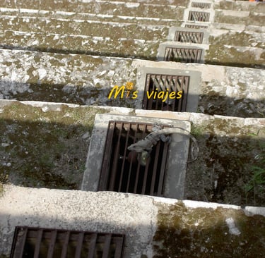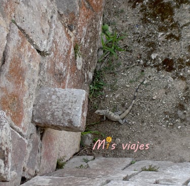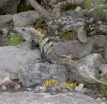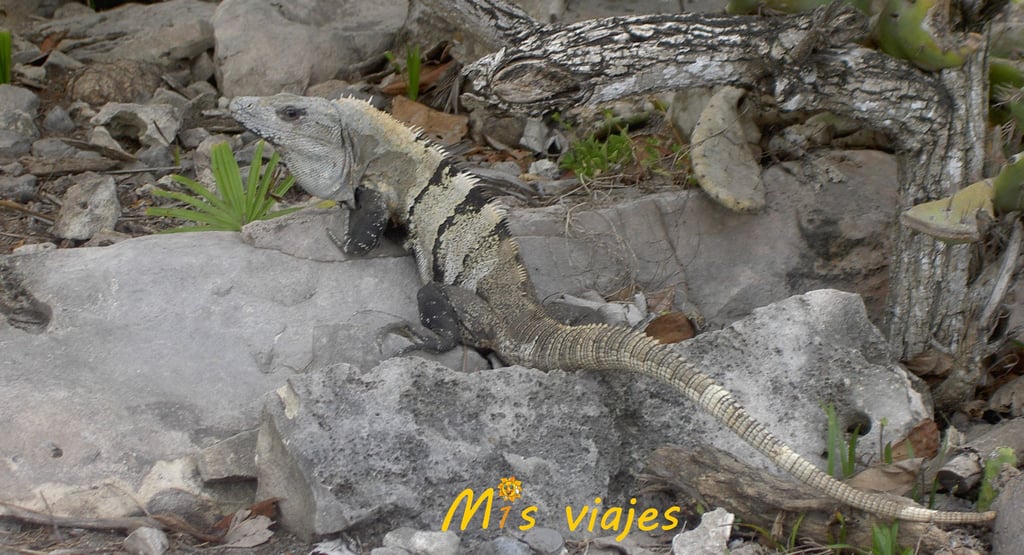En un lateral de la pirámide nos encontramos con una iguana verde, conocidas en Yucatán como "tolok", en maya. Estos reptiles en México, más concretamente en la península de Yucatán, están presentes en bosques, manglares, áreas urbanas, ríos, lagos y lagunas.