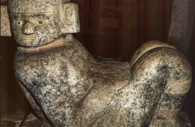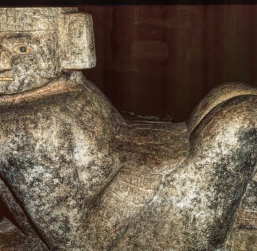 El Chac Mool es una estatua de un hombre reclinado sobre su espalda, con las piernas flexionadas y sosteniendo un recipiente sobre su estómago.