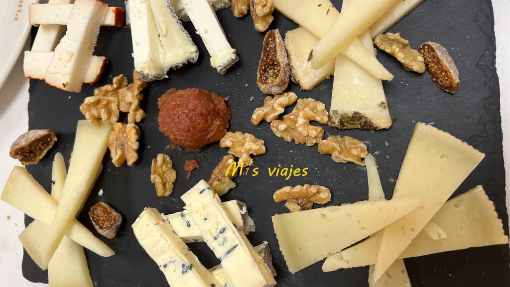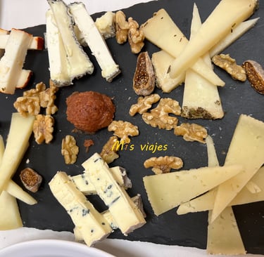 La tabla de quesos, con higos, membrillo y nueces está delicioso, trae cuatro trozos de cada tipo de queso así que es ideal para compartir los cuatro.