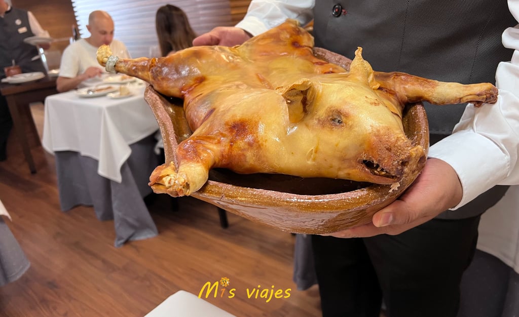 Nos presentan el cochinillo entero en una bandeja de barro, lo que realza su aspecto rústico y tradicional.