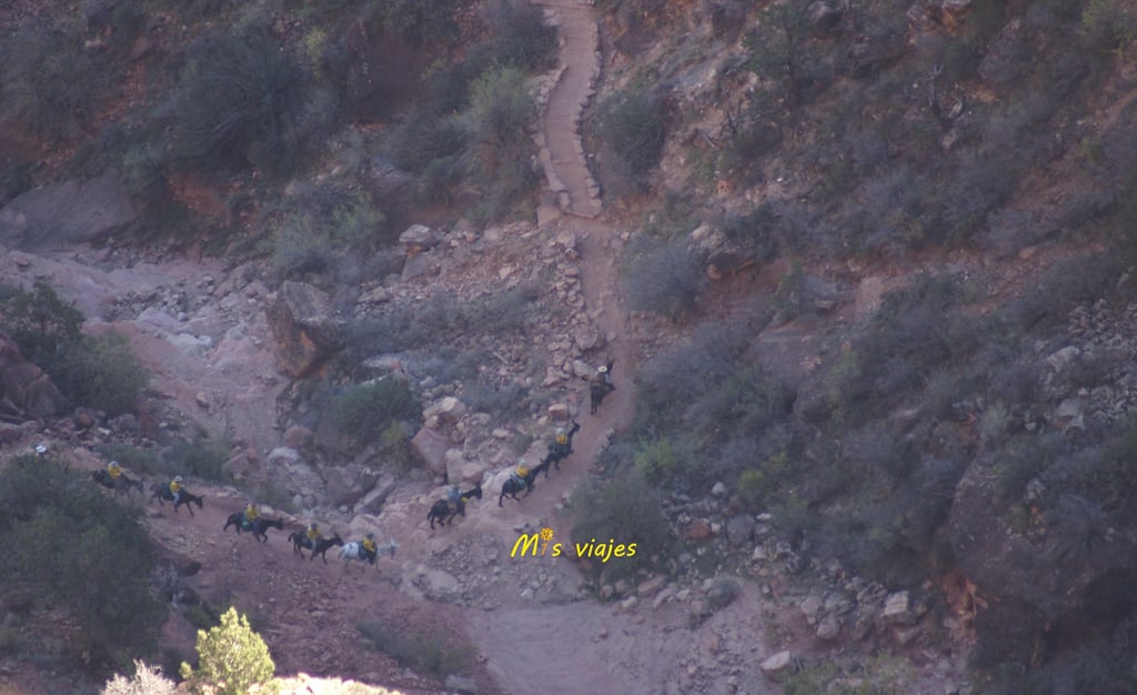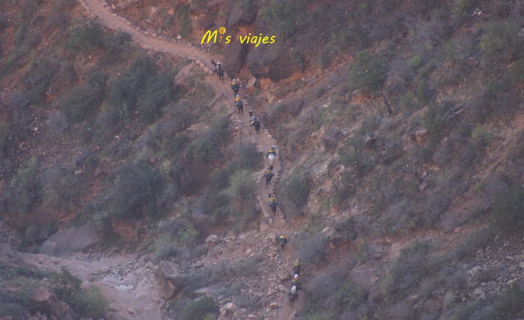 Desde aquí arriba podemos ver un sendero recorrido por jinetes con sus caballos, se trata del Bright Angel Trail, la ruta de senderismo más conocida y transitada del Gran Cañón.