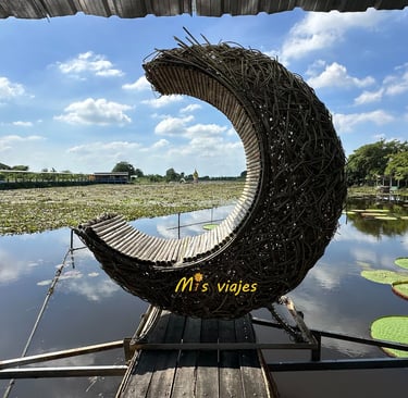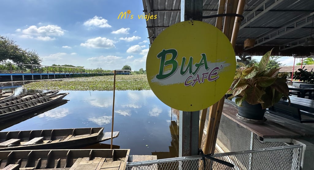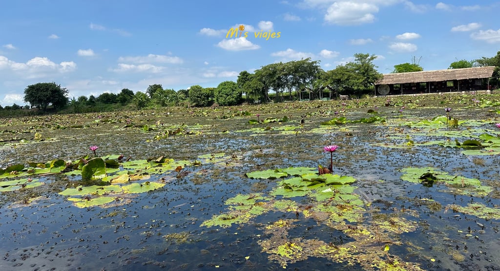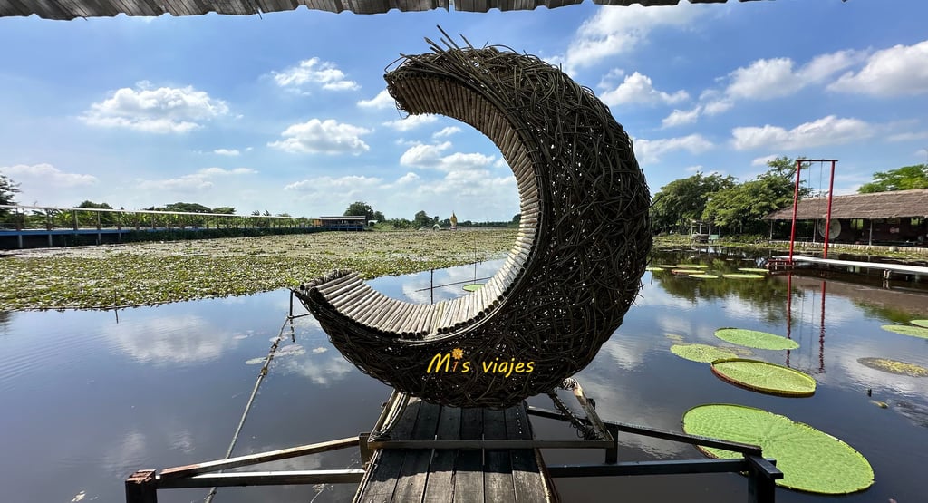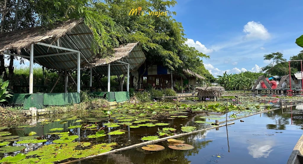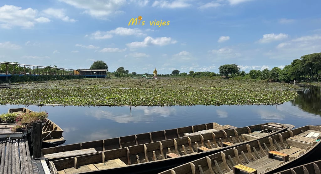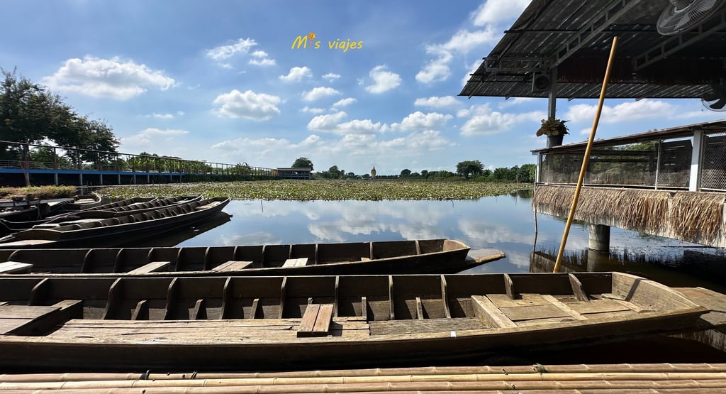 Una vez traspasas la puerta, ya puedes ver el lago cubierto de flores de loto y las barcas tradicionales tailandesas.