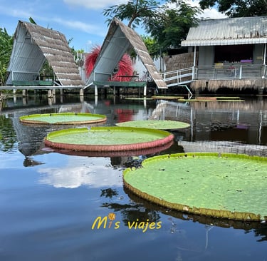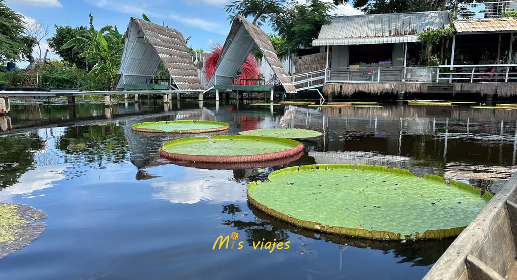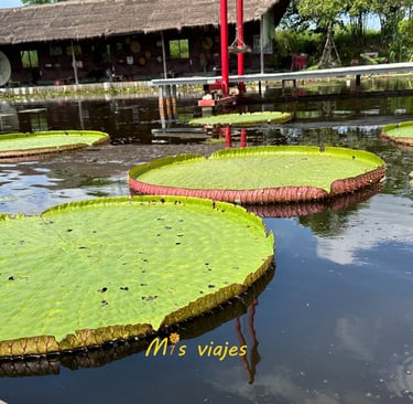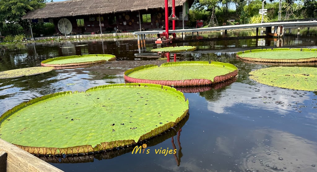 Cerca de la salida del circuito, frente al restaurante vemos unas hojas enormes circulares, son hojas de loto gigante de la Amazonia, conocidas por Bua Kradong o Bua Victoria.