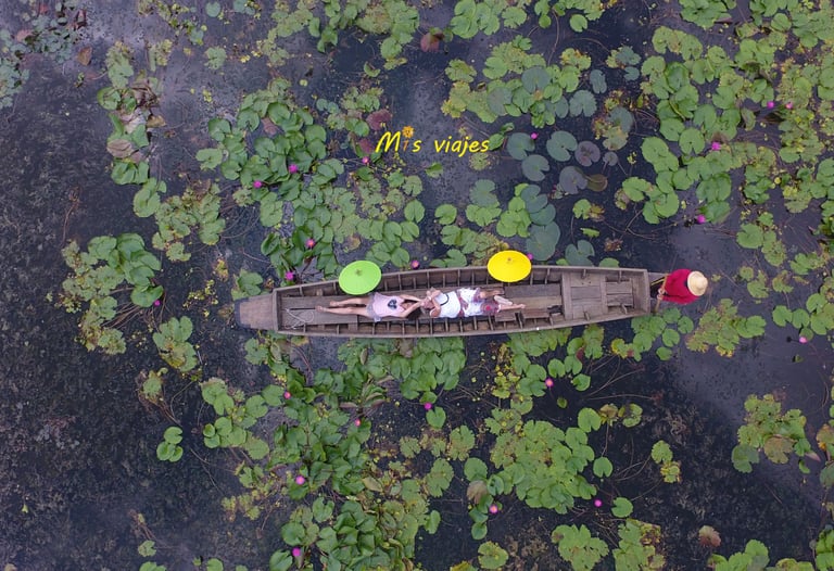 Los barqueros reman de pie con un remo largo y empujan suavemente la barca de madera, se mueven por zonas menos frecuentadas por los lotos, para no dañarlos.