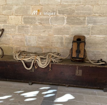 En el claustro también podemos ver algunos elementos, como esta polea antigua y un precioso baúl.