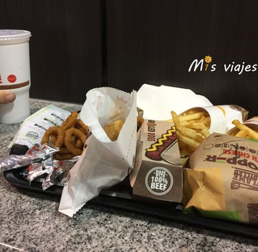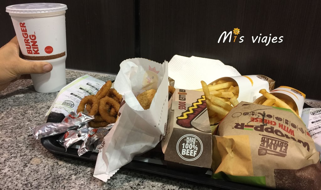 Pedimos un par de hamburguesas, dos raciones de patatas, 10 nuguets, aros de cebolla y dos refrescos, precio 21,23$ (19,65€).