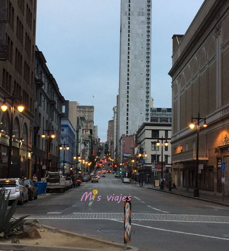 Panorámica de una calle cualquiera de San Francisco anocheciendo.
