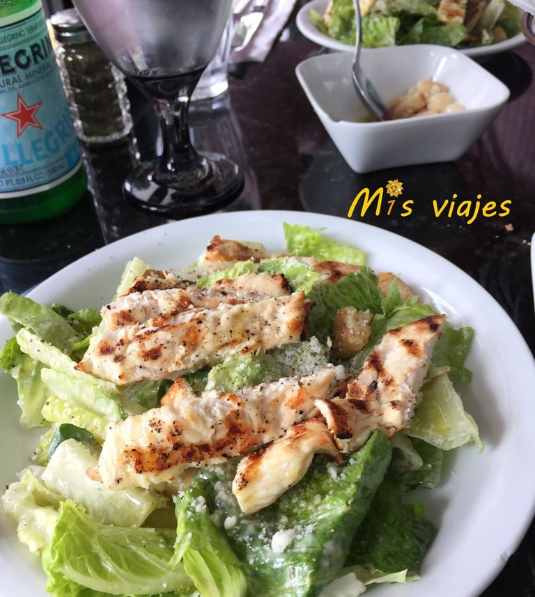 Nos pedimos dos ensaladas César, una pizza diavola y unos spaguettis al pesto. Nos traen un picadito con judía blanca mientras esperamos los platos pedidos.