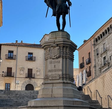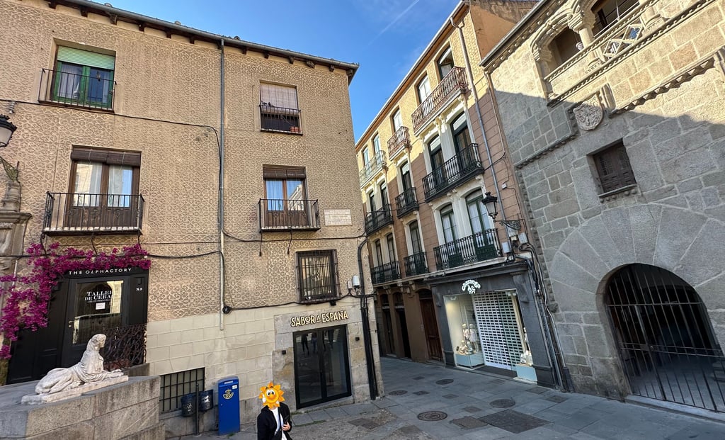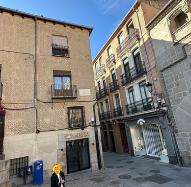 Llegamos a una pequeña y triangular plaza, rodeada de edificios nobles, su nombre, Juan de Oquendo, fue un platero(orfebre) segoviano del siglo XVI, que da fe de la tradición artesanal de la zona. La placa en una fachada ubicada en esta concurrida plaza así lo explica.