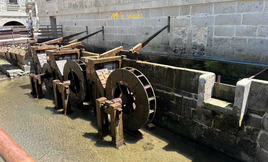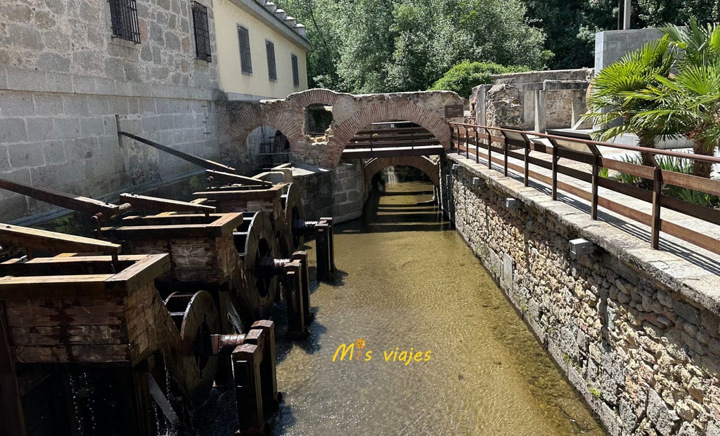 El río Eresma se desvía por un canal artificial, la fuerza del agua mueve dos ruedas hidráulicas, que van unidas a un eje de madera, que a su vez mueve los engranajes y las bielas.