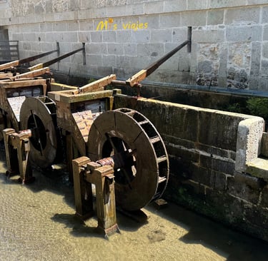 En la parte trasera del edificio, justo donde el río pasa por debajo, encontramos las ruedas hidráulicas y las prensas originales que hicieron famosa esta fábrica en todo el mundo.