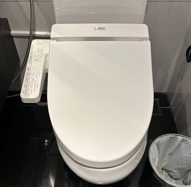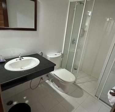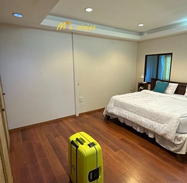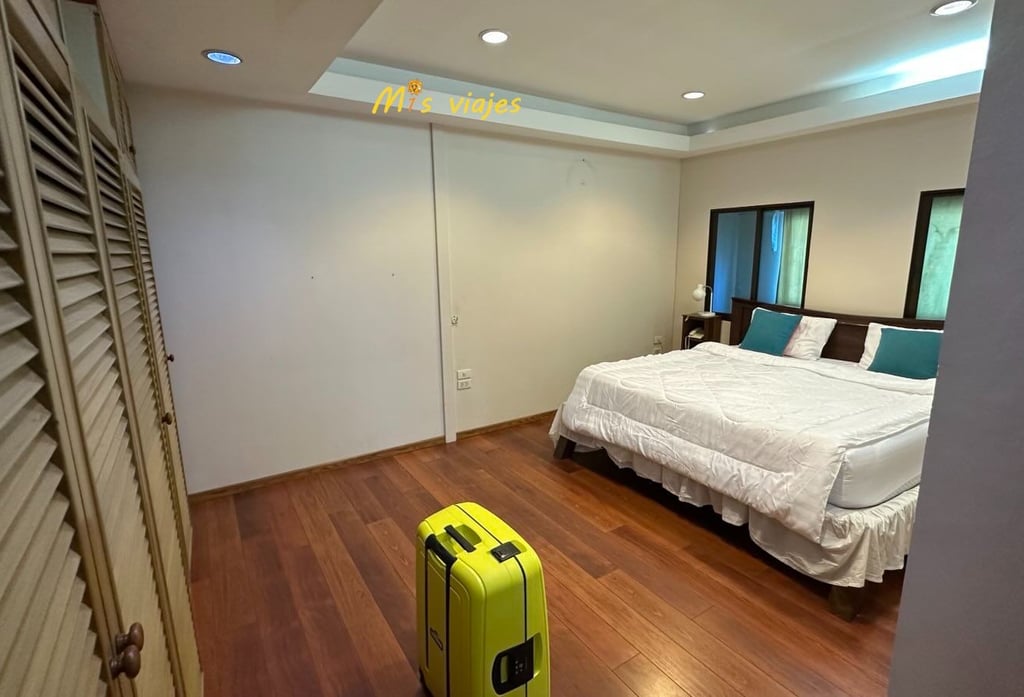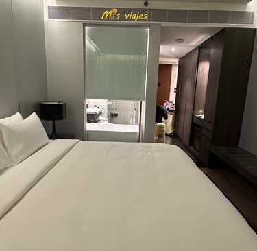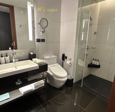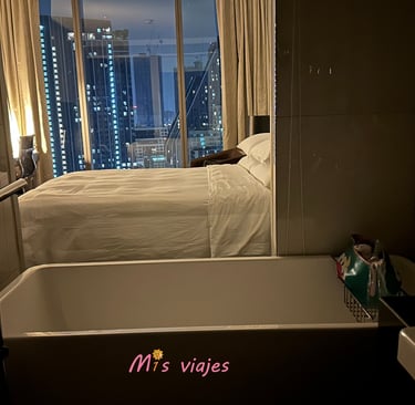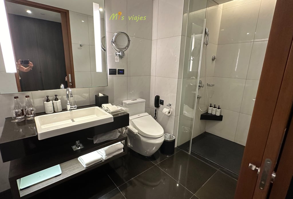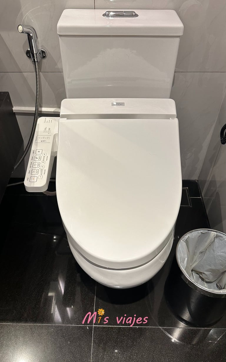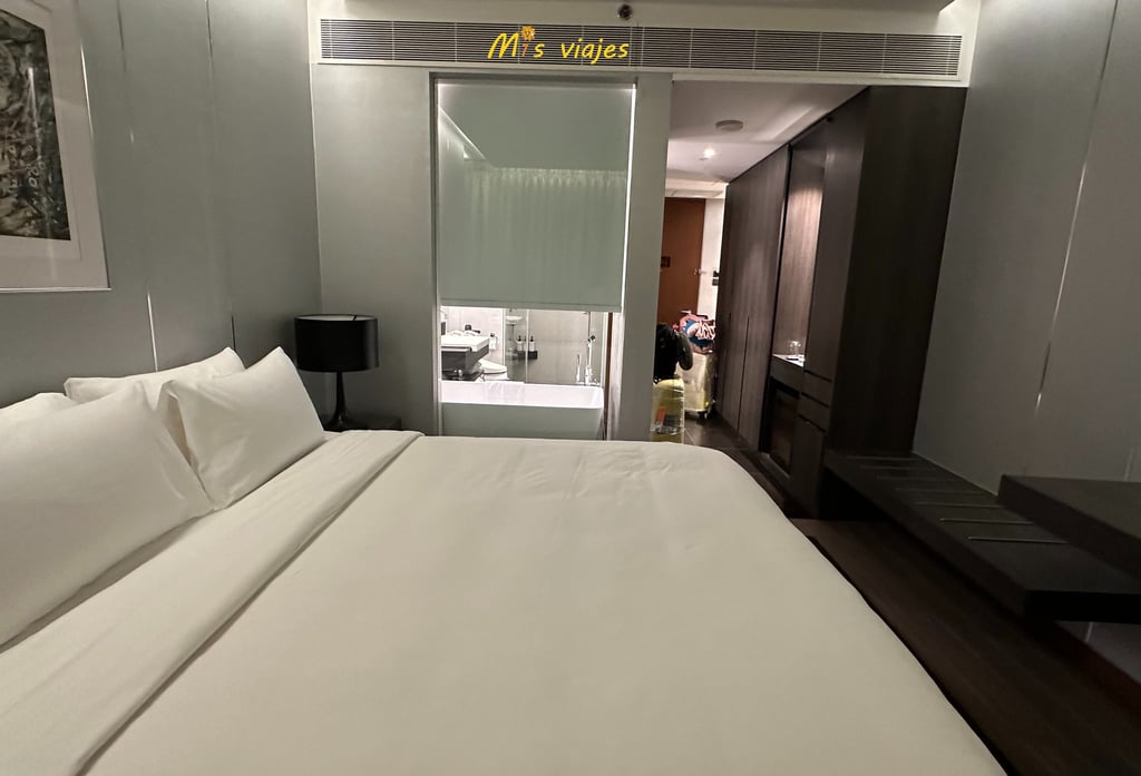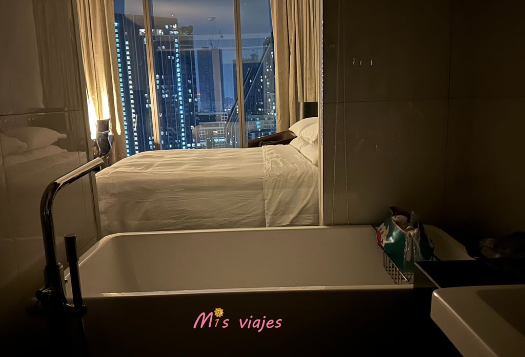 El dormitorio tiene una cristalera enorme que te permite disfrutar del skyline de Bangkok. Una cama gigante (algo bastante habitual en Tailandia), un baño que no le falta detalle, incluye un inodoro inteligente con funciones electrónicas. escritorio, etc.