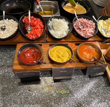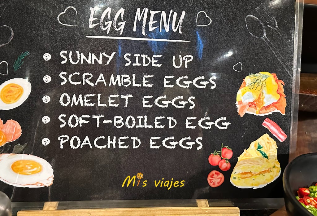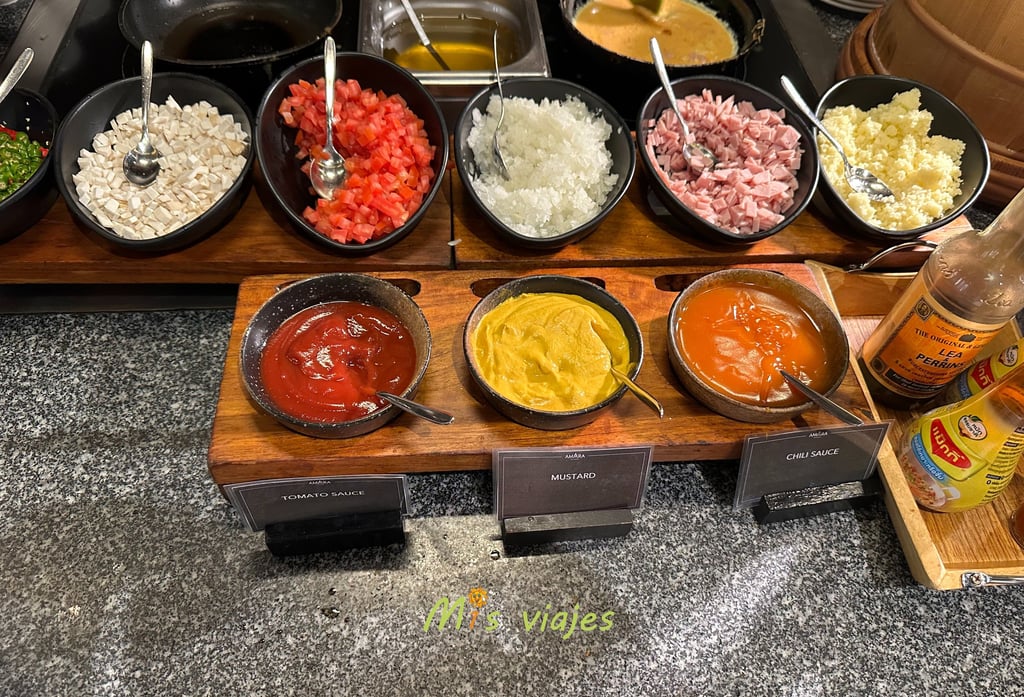 Buffet de desayuno con diferentes preparaciones de huevos y tortillas