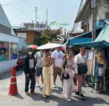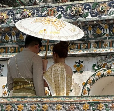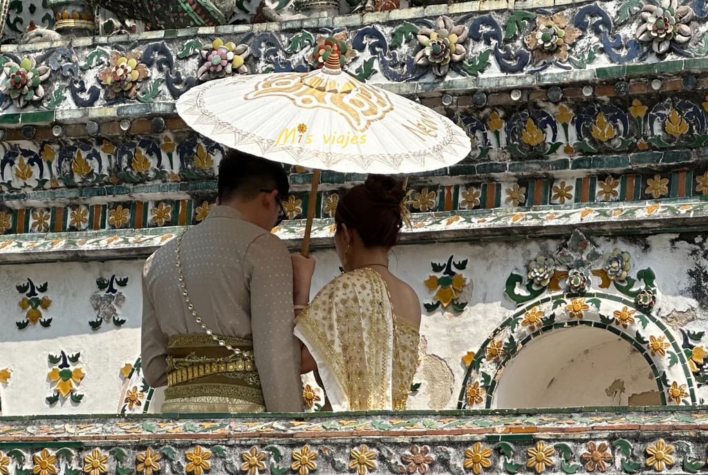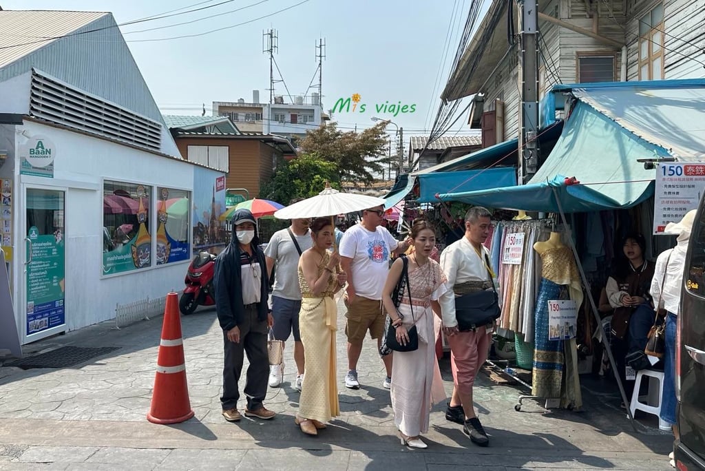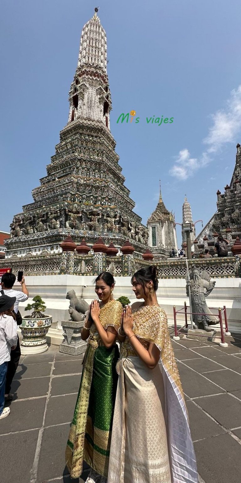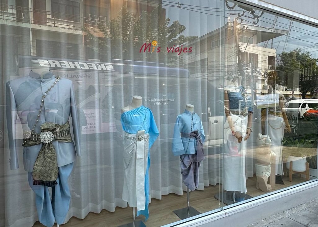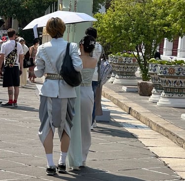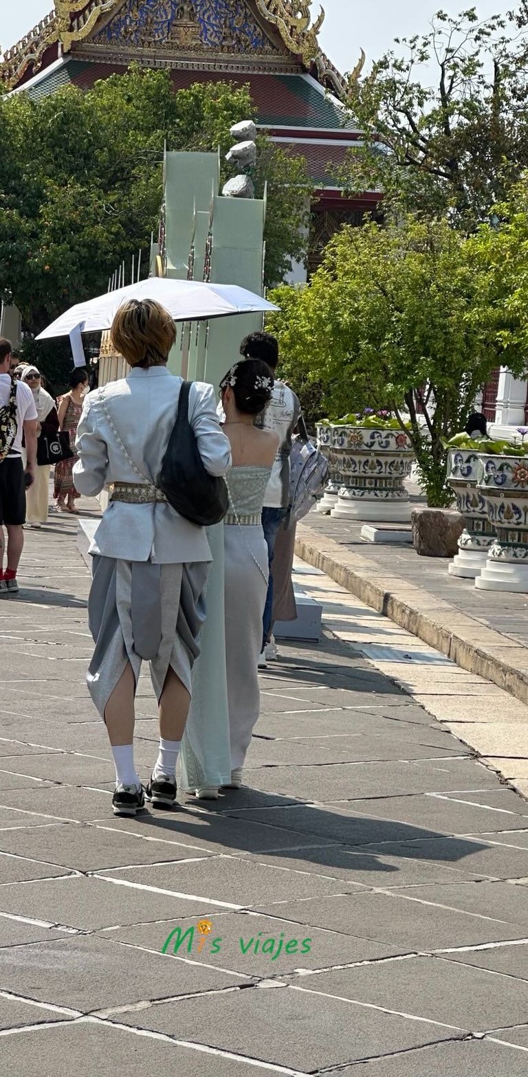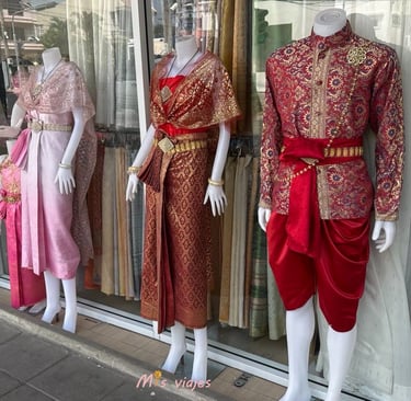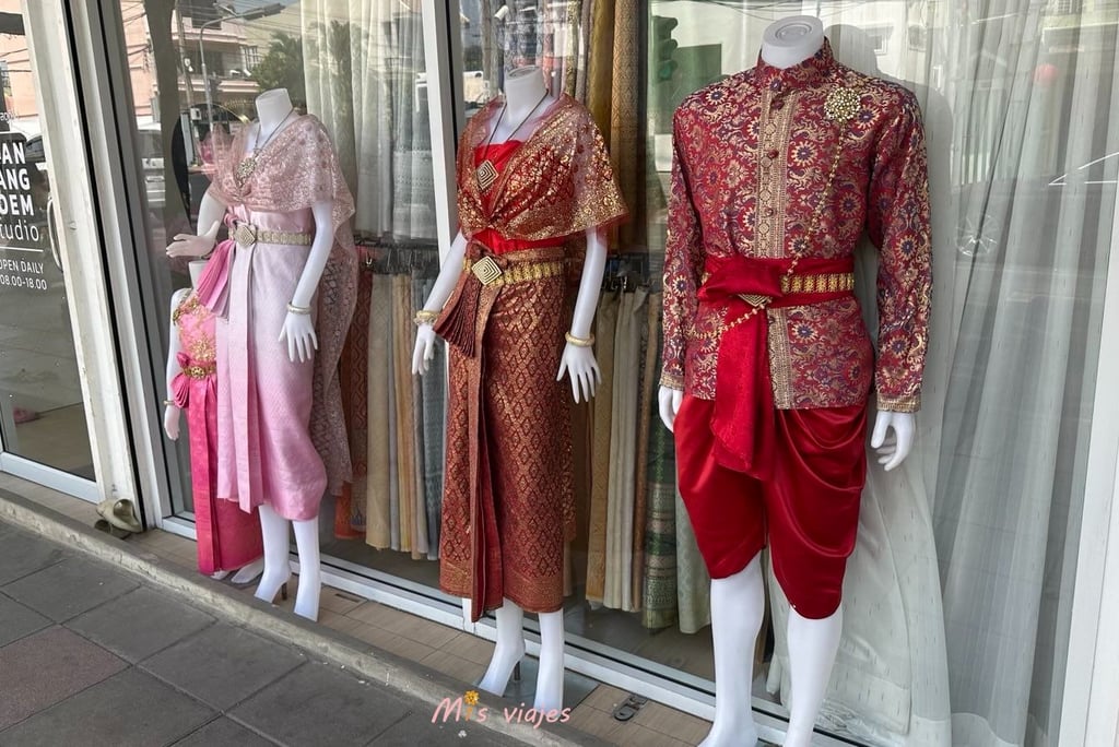 A menudo, los trajes tradicionales tailandeses, como los de la reina o el rey tailandés, son alquilados en tiendas cercanas a los templos o lugares turísticos.