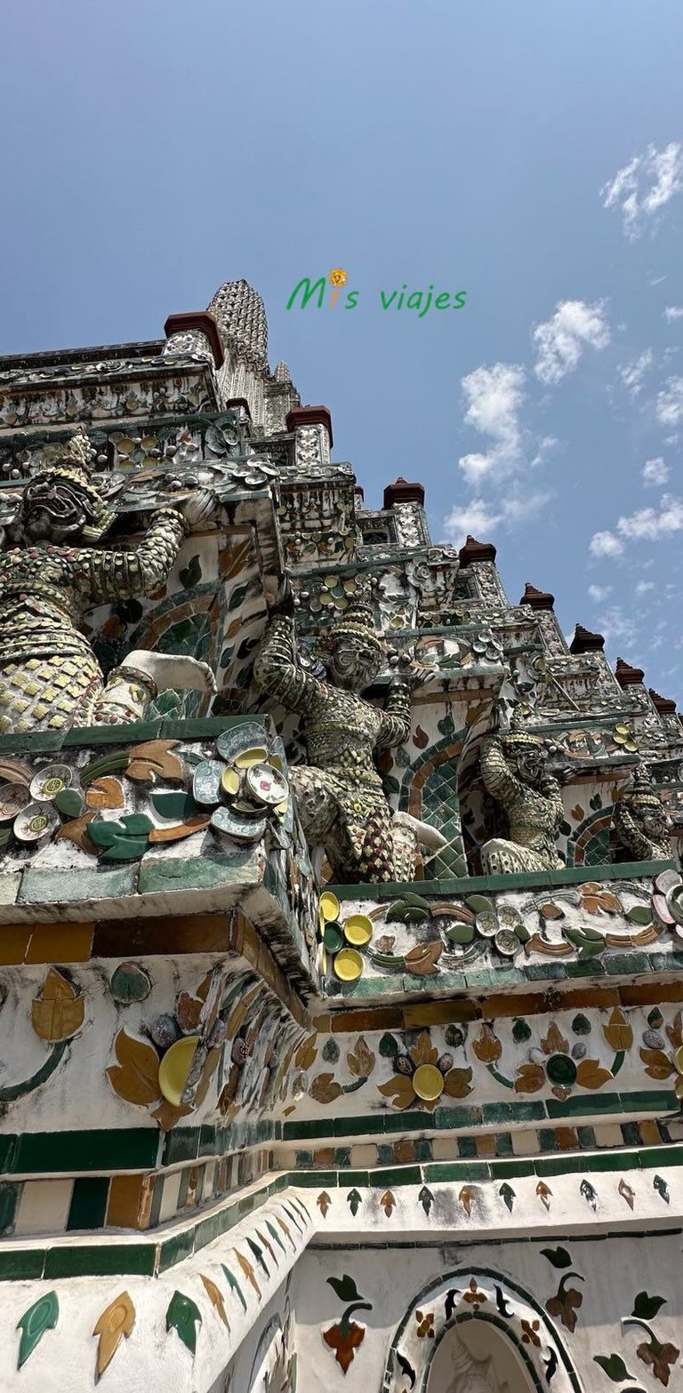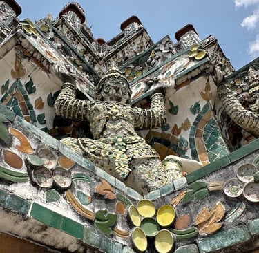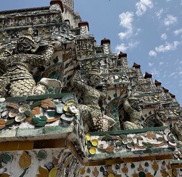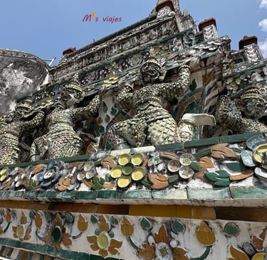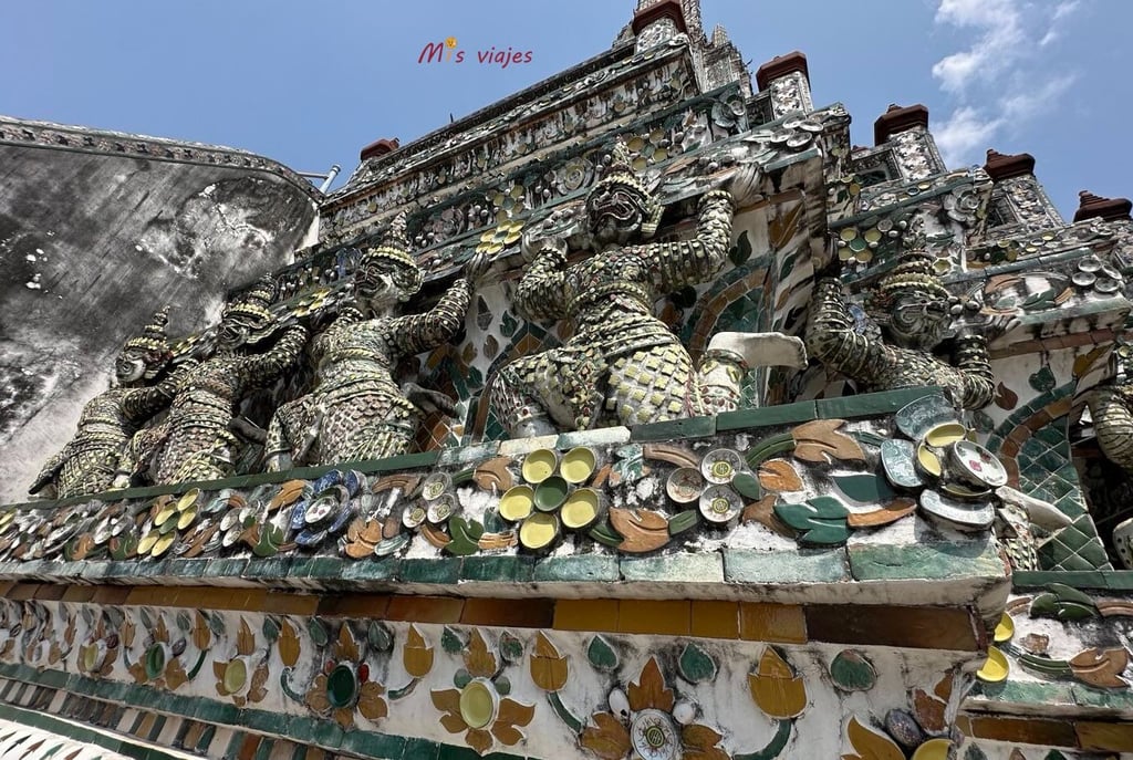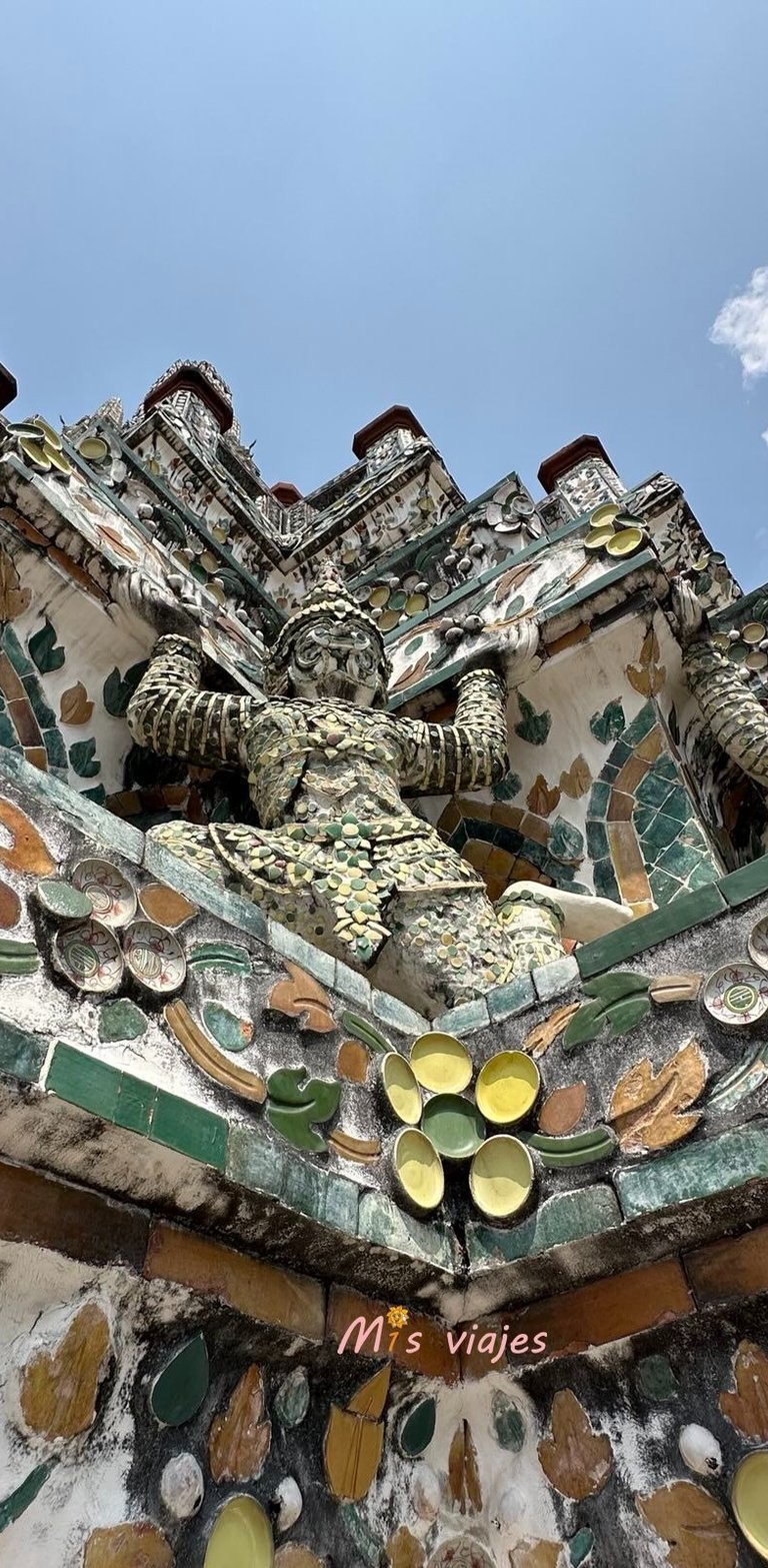 En el Wat Arun puedes encontrar figuras mitológicas que representan a yakshas (guardianes espirituales) y rakshasas (demonios mitológicos) que son comunes en el arte religioso budista de Tailandia.