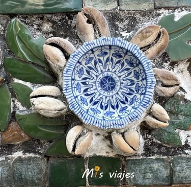 Esta torre está decorada con fragmentos de porcelana china y vidrio coloreado, lo que crea un hermoso brillo cuando el sol la ilumina, dándole un aire de magnificencia.